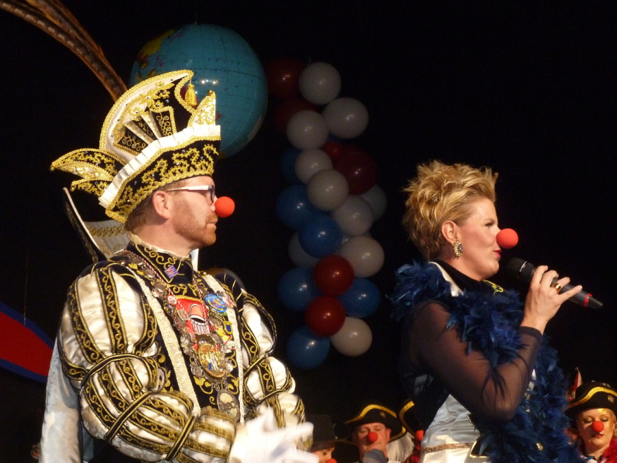 Dann kündigte sich der Auftritt des richtigen Prinzenpaars an, alle im Saal mussten die bereitliegenden roten Nasen aufsetzen. Manuela I. und Harald I. kämpften sich auf die Bretter und hatten ihre Garde und GECK mitgebracht, diesmal mit Uli Mebus in seiner eigentlichen Rolle. An diesem Abend sprach erwartungsgemäß nur die Prinzessin zu ihrem Närrinnenvolk, und die Garde wurde von Hauptfrau Linda kommandiert. Manuela bat statt Geschenken um einen Beitrag zur Stiftung „Humor hilft heilen“ und ließ die roten Sammelbüchsen im Saal kreisen. Aber Prinz Harald hatte dann doch noch einen Auftritt mit seinem Sessionslied vom Karneval.